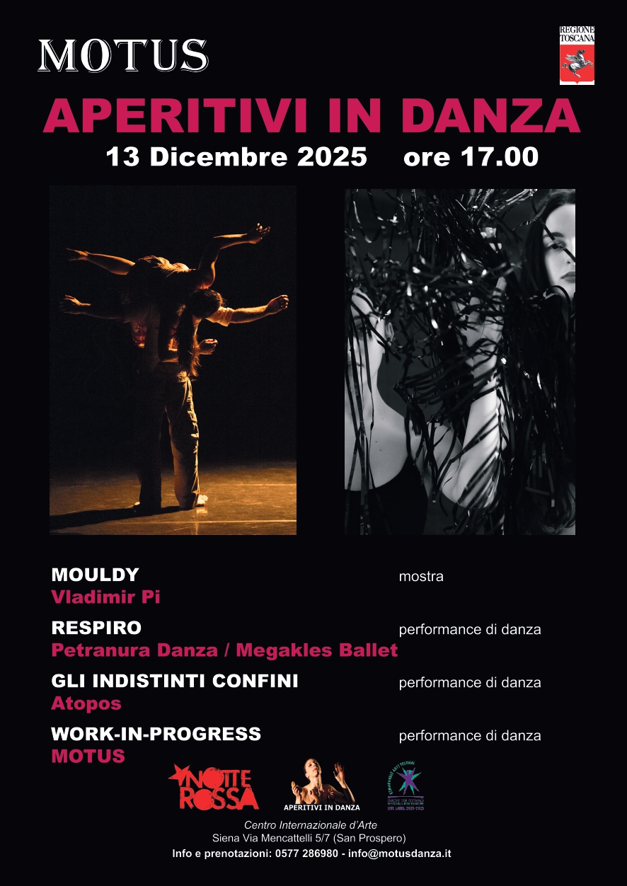Sabato 13 dicembre 2025 alle ore 17,00 la Rassegna “Aperitivi in danza”, organizzata da MOTUS al Centro Internazionale d’Arte (Via Mencattelli 5/7, Siena), presenta un ricco programma di danza con ben tre performances che saranno precedute da un vernissage. L’evento è inserito nel calendario della “Notte Rossa dei Circoli Arci della Toscana” cartellone identitario che raccoglie ogni anno la moltitudine di iniziative realizzate dai Circoli e Comitati della Toscana.
