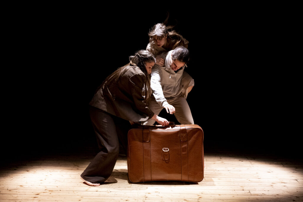Al centro della scena, inizialmente vuota, emerge un solo oggetto: una valigia consunta, carica di tensione simbolica. Attorno a essa si muovono tre giovani interpreti (Martina Grandin, Michelangelo Raponi, Alice Staccioli) che prendono, lasciano, usano, contendono e rifiutano ciò che la valigia contiene, alla ricerca di un contorno che dia senso al proprio mondo interiore.
